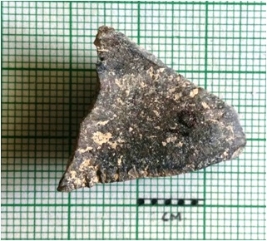 | Description / विवरण | The schist flake of triangular shape has sharp edges and angular edges. The piece has surfacial flake scars and negative flak scars. |