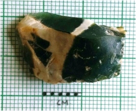 | Description / विवरण | The jasper flake has a shallow bulb of percussion and edges due to flaking. The deep colored flake has a median ridge due to flaking. The flake has angular edges and sharp pointed ends. |