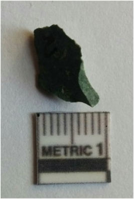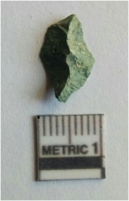 | Description / विवरण | The flake has sharp edges as a result of flaking. The piece has tapering ends and a sharp point due to lithic knapping. One end is rounded as a result of deposition. |