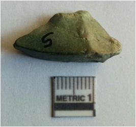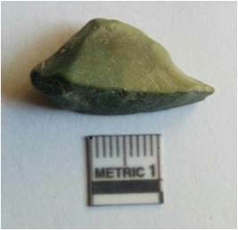 | Description / विवरण | Green chert fragment with a median ridge as a result of flaking. |