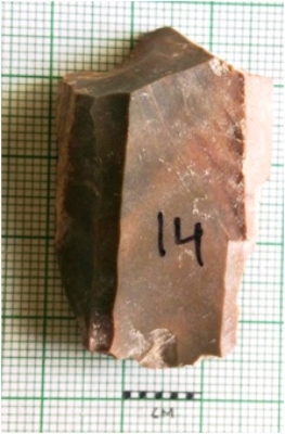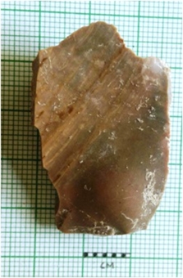| Description / विवरण | The pale brown chert flake has a bulb of percussion and transverse flaked ridges. The flake has a cortex end. |