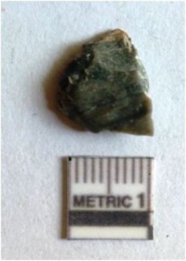 | Description / विवरण | The chert flake is grey in color, with rough triangular shape and a shallow bulb of percussion. The piece has pointed ends due to flaking. |