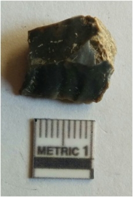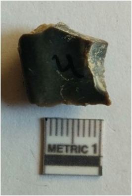 | Description / विवरण | The jasper flake has sharp flaked ends and a roughly triangular shape. The piece has a bulb of percussion and tapering ends. The piece is a secondary flake produced during lithic flaking activity. |