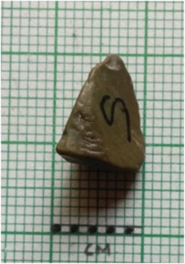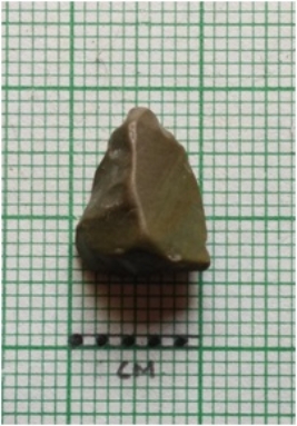 | Description / विवरण | The green jasper fragment has a bulb of percussion and flaked edges. |