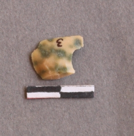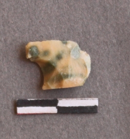 | Description / विवरण | It is a Chert fragment. Flaked with cut ends. With copper impurities internally forming green patches, there is an irregular mark on the bulb of percussion. |