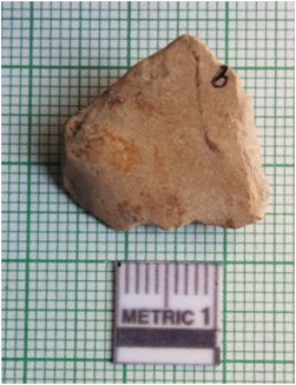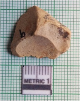 | Description / विवरण | The chert piece has flaked sides and sharp cutting edges due unintentional flaking. The piece has a rough surface on the non flaked end. |