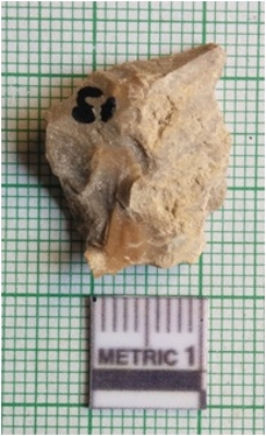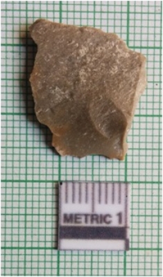 | Description / विवरण | The chert flake is blocky, with flake scars on the surface. The piece has sharp edges, Retouched at ends for a tapering edge. The piece has a fragment of cortex on one side. |