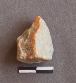 | Description / विवरण | It is an Agate nodule. The surface is covered with cortex. It is chipped from one end. Flake scars on one end of the surface. |