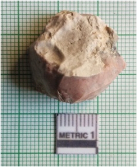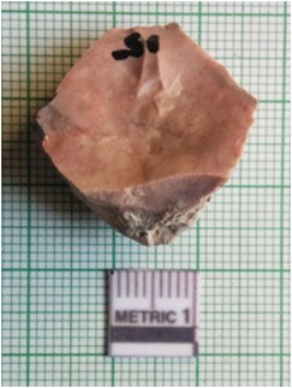 | Description / विवरण | The chert flake is blocky, with flake scars on the surface. The piece has sharp edges, Retouched at ends for a tapering edge. The piece has a fragment of cortex on one side. |