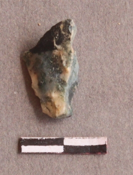 | Description / विवरण | This is a Jasper fragment with cut uneven edges, flaked. Mossy deposition can be seen on some portion internally. |