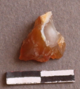 | Description / विवरण | It is a Chalcedony flake, It is orangish in color, flake edges on the surface with ripple on it due to heavy percussion. |