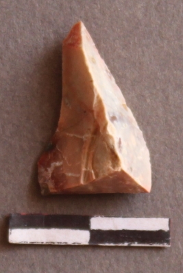 | Description / विवरण | It is a jasper flake with sharp edges and striking platform on the proximal end. Flakes scars on the surface |