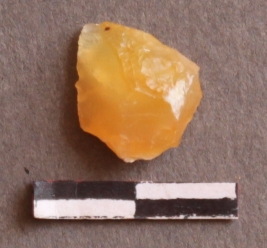 | Description / विवरण | It is a chalcedony flake with bulb of percussion on ventral side of the fragment. Flake ridges on the surface. |