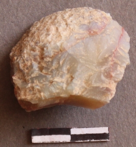 | Description / विवरण | It is a Chalcedony nodule. It is partly covered with cortex. Prominent flake ridges on the surface are visible. |