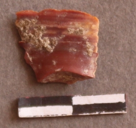 | Description / विवरण | It is a jasper fragment. with sharp edges and pointed ends. Prominent flake scars on the surface. Cortex on one end of the fragment. |