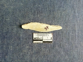 | Description / विवरण | Shell piece is pale white in color with ropy structure on it woing to natural formation. The piece has a pointed end and a flat cut opposite end, the shaff has a slight curvature. |