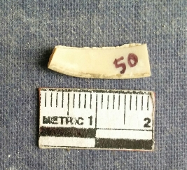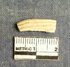 | Description / विवरण | Shell piece is pale white in color with ropy structure on it woing to natural formation. The piece has a pointed end and a flat cut opposite end, the shaff has a slight curvature. |