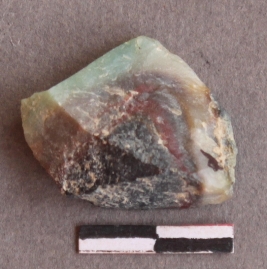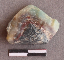 | Description / विवरण | It is a jasper fragment, patinated with copper impurities. Prominent flake ridges on the surface. |