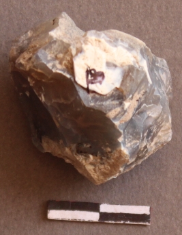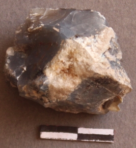 | Description / विवरण | It is a Quartz nodule. Flake scars on the surface. Cryptocrystalline in structure. Cortex on one point of the nodule. |