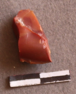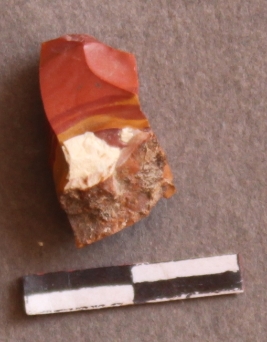 | Description / विवरण | It is jasper lithic debitage, flake ridges on the surface heat treatment on it. Ripples on the surface due to heavy percussion, striking platform with bulb on the ventral side. |