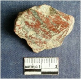 | Description / विवरण | Blood stone chunk with a prominent positive bulb and sharp edges. |