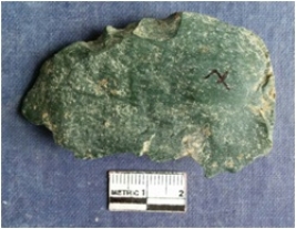 | Description / विवरण | The chert piece resembles a flake tool with tapering end and retoucned edges. The median ridge is promient with numerous flake scars on the surface. The end is trucated or battered. |