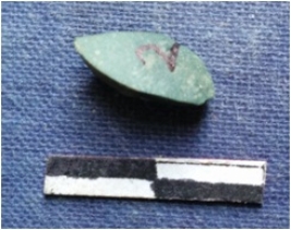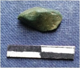 | Description / विवरण | The chert flake has a sharp edge with a pointed end and flat surface. |