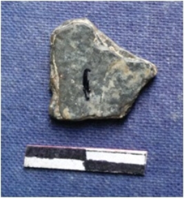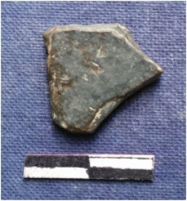 | Description / विवरण | Flat black schist piece with slightly rounded edges. |