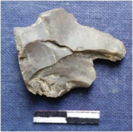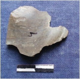 | Description / विवरण | Flat chert piece in most likelihood a detached flake with a negative bulb of percussion. |