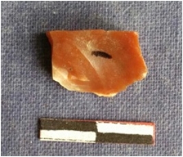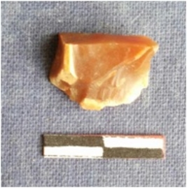 | Description / विवरण | The chalcedony flake has ripples scars and a prominent bulb of percussion with sharp flaked edges. |