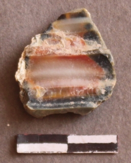 | Description / विवरण | Banded agate patinated with copper impurities. Cortex on one end. Flake ridges with ripples on it. |
