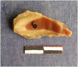 | Description / विवरण | The chert flake has colored bands on the surface and cortex on one end. The piece has sharp edges as a result of flaking. |