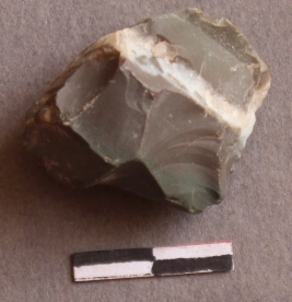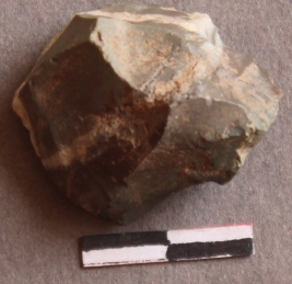 | Description / विवरण | It is a Jasper nodule. With flaked edges. There is a white crystalline band across the surface. |
