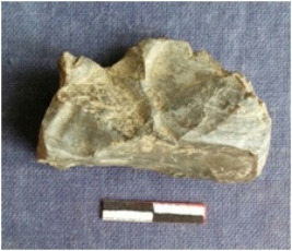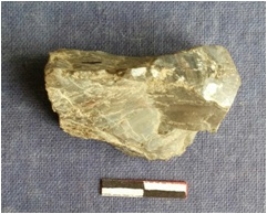 | Description / विवरण | The chert piece is grey in color with chunky appearance and flaked sides. The piece has numerous surfacial flake scars. |