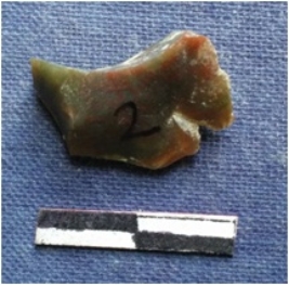 | Description / विवरण | Jasper piece has a prominent median flake and surfacial flake scars. The piece is C shaped. |