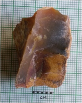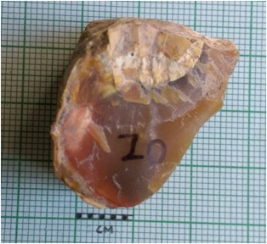 | Description / विवरण | The jasper chunk has flaked edges and a part of cortex. The flaked piece is a secondary flaked detached as a part of primary core preparation. |