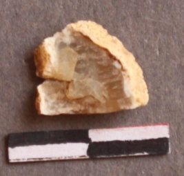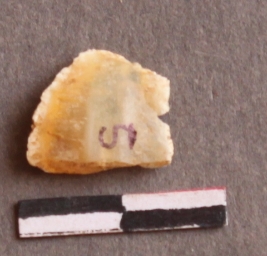 | Description / विवरण | It is a chalcedony flake. Cortex on one side of the surface. Flake scars on the surface. Bulb of percussion on the ventral side of the flake. |