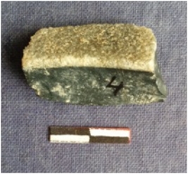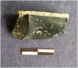 | Description / विवरण | The basaltic schist piece has sharp edges as a result of flaking and a basal cortex part. |