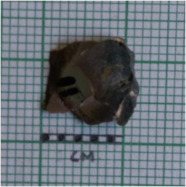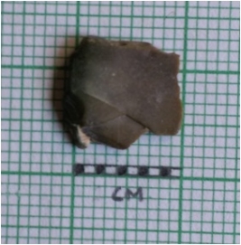 | Description / विवरण | The flake is small, roughly triangular in shape. The piece has surfacial flake scars and ridges owing to flaking. The flake has broken edges either due to physical fracture or as a result of knapping. |