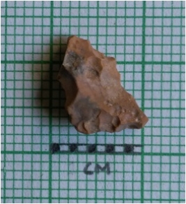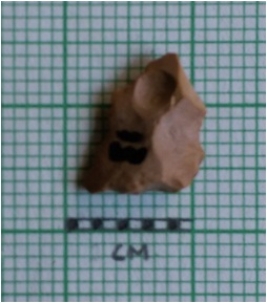 | Description / विवरण | The flake is small, roughly triangular in shape. The piece has surfacial flake scars and ridges owing to flaking. The flake has broken edges either due to physical fracture or as a result of knapping. |