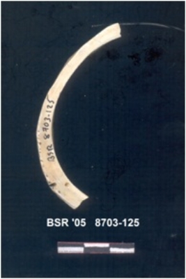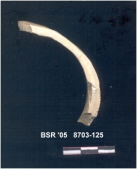 | Description / विवरण | A piece of shell bangle manufacturing waste. Glossy interior. Many worm infestation holes. |