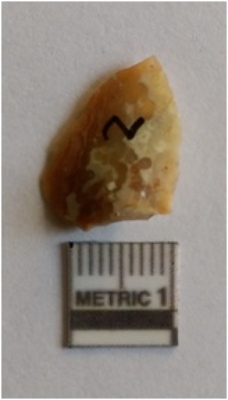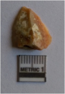 | Description / विवरण | The flake is a detached piece from the core at the time of lithic knapping. The flake has a sharp edge and surfacial flake scars. The piece has a bulb of percussion and a basal end. |