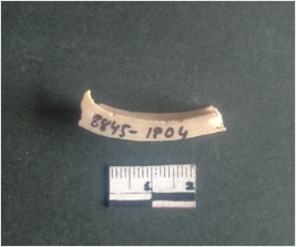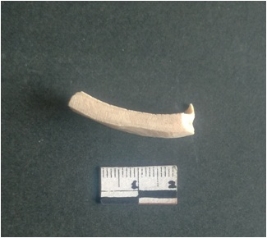 | Description / विवरण | This is a fragment of an unfinished shell circlet. It is an unfinished bangle fragment. It is white in color with polished inner surface and grounded outer surface. Rectangular in cross section. |