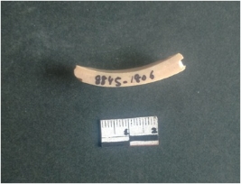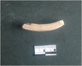 | Description / विवरण | This is a fragment of an unfinished shell circlet. It is an unfinished bangle fragment. It is white in color with polished inner surface and grounded outer surface. Rectangular in cross section. |