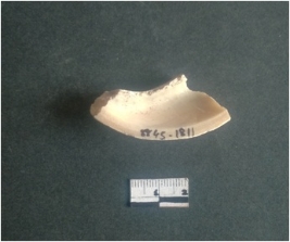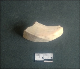 | Description / विवरण | This is a fragment of an unfinished shell circlet. It is an unfinished bangle fragment. It is white in color with polished inner surface and grounded outer surface. Rectangular in cross section. |