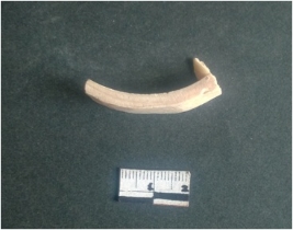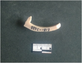 | Description / विवरण | This is a fragment of an unfinished shell circlet. It is an unfinished bangle fragment. It is white in color with polished inner surface and grounded outer surface. Rectangular in cross section. |