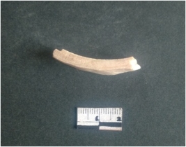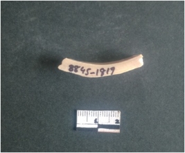 | Description / विवरण | This is a fragment of an unfinished shell circlet. It is an unfinished bangle fragment. It is white in color with polished inner surface and grounded outer surface. Rectangular in cross section. |