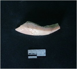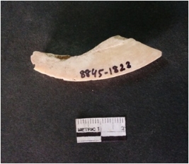 | Description / विवरण | This is a fragment of an unfinished shell circlet. It is an unfinished bangle fragment. It is white in color with polished inner surface and grounded outer surface. Rectangular in cross section. |
