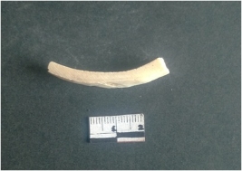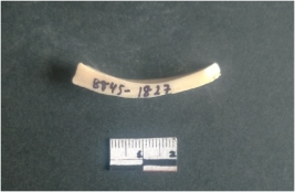 | Description / विवरण | This is a fragment of an unfinished shell circlet. It is an unfinished bangle fragment. It is white in color with polished inner surface and grounded outer surface. Rectangular in cross section. |