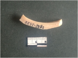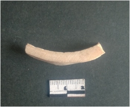 | Description / विवरण | This is a fragment of an unfinished shell circlet. It is an unfinished bangle fragment. It is white in color with polished inner surface and grounded outer surface. Rectangular in cross section. |